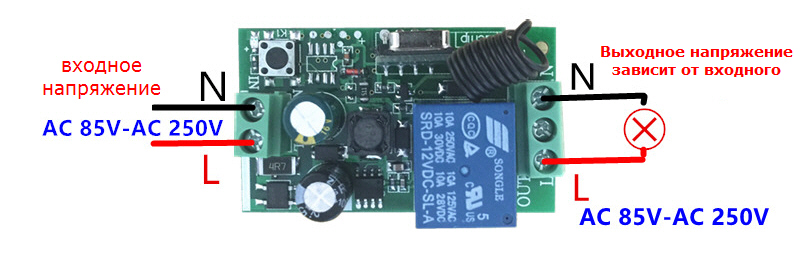 Технические характеристики [Входная мощность] AC 85В - 250В [Выходная мощность] 220В 10А [Частота RF] 433 Мгц (mgz) [Режим работы RF] superheterodyne [Чувствительность приемника] > 97 дб [Режим декодирования] MCU программное декодирование [Тип кодирования:] EV1527 [Тип вкл\выкл] фиксированное или по нажатию [Тип коммутации] нормально открытый и нормально закрытый [Выход реле №1] N O: нормально открытый COM: общий N C: нормально закрытый [Пульт Д.У. , передатчик] в комплекте [Каналов управления на пульте] 2 [Потребение в режиме ожидания] < 5 MA [Расстояние приема передачи] до 50 м [Кол-во передатчиков] 1-25 передатчиков [Габариты (Ш, Г, В)] 54*32*18 мм [Режимы работы] Мгновенный, Вкл\Выкл с фиксацией, Переключение